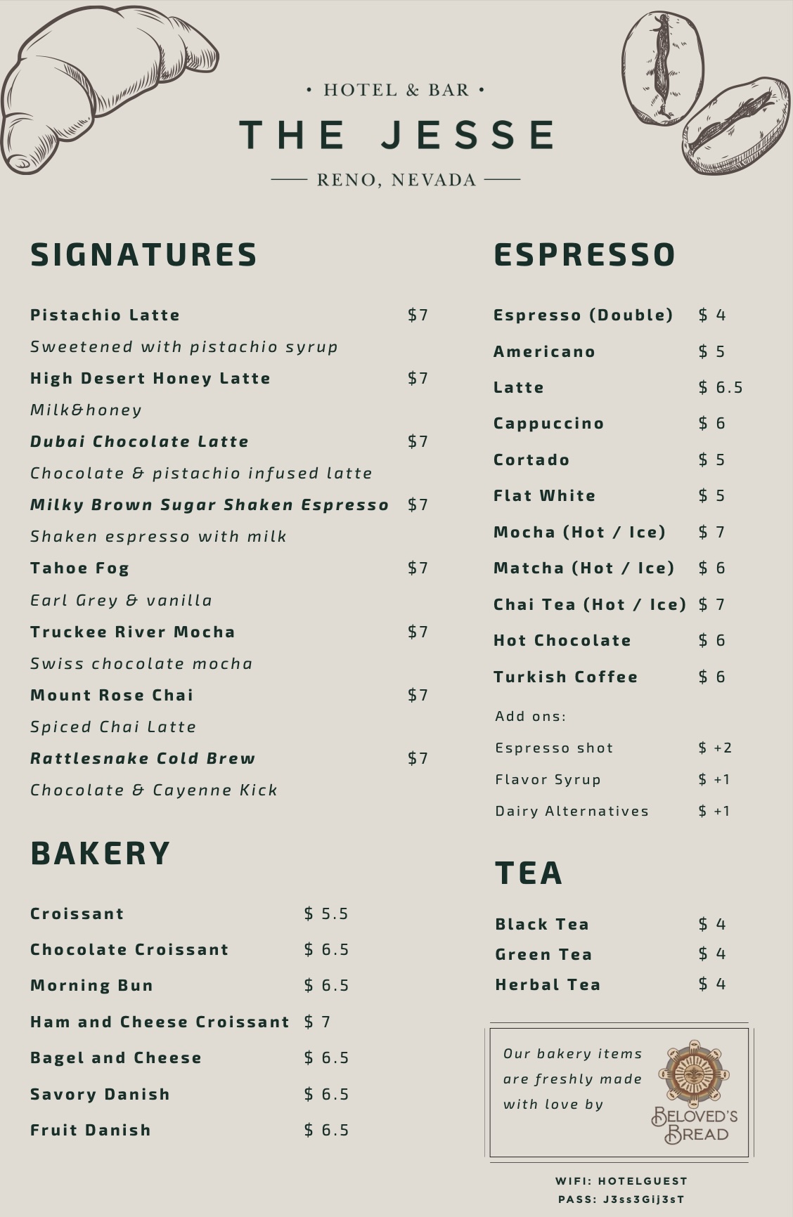 The bar at The Jesse is warm, inviting, and comfortable. Our offerings include seasonal craft cocktails, beer, and wine.