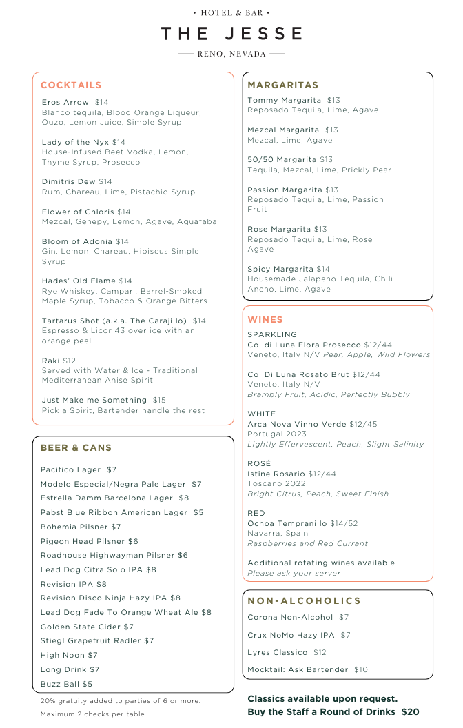 The Jesse is located in downtown Reno on the corner of East 4th Street and Evans Avenue, just north of the Truckee River, and slightly east of Virginia Street, Reno’s main thoroughfare. The Jesse’s parking lot is conveniently located adjacent to the hotel on East 4th Street, just to the east of the property. Parking is for overnight hotel guests and patrons of the bar and restaurant.