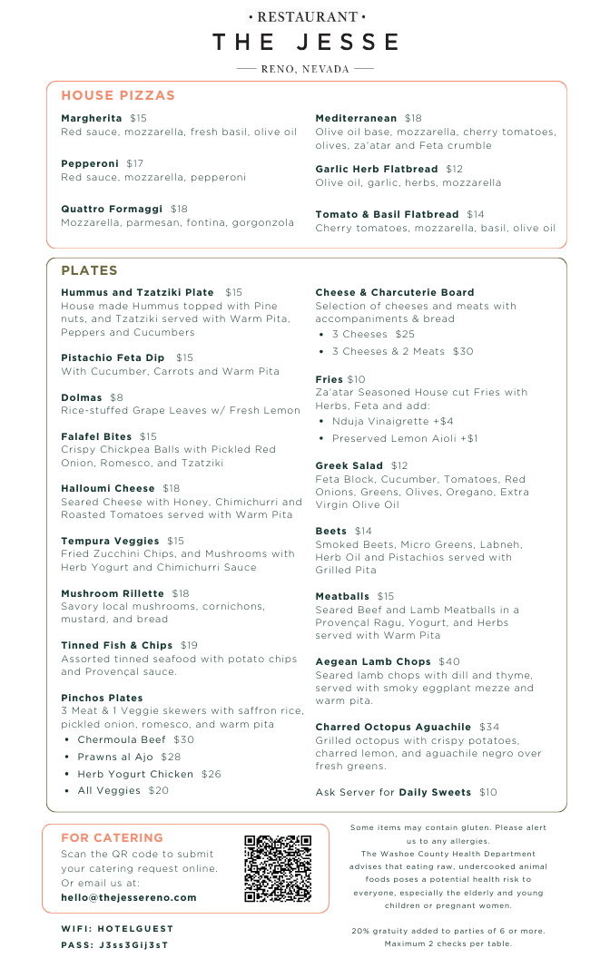 Located inside The Jesse Hotel, The Jesse Restaurant and Bar is a vibrant and welcoming Mediterranean eatery inspired by Greek and Turkish flavors. Our menu features shareable dishes like crispy potato chips, house-made hummus, grilled kofte, and shrimp all crafted with fresh ingredients and bold, honest flavor.